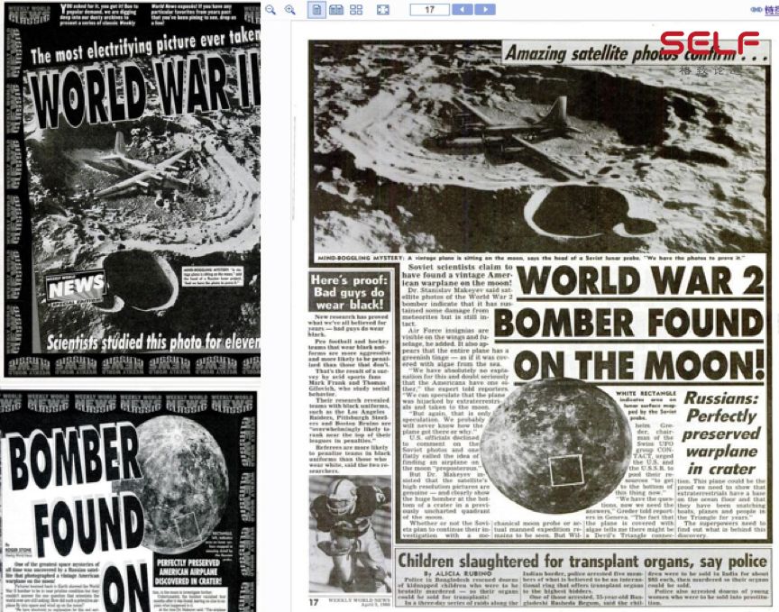 美国最有名的一个杂志叫《世界新闻周刊》,这个杂志很有权威性,1988年4月5日登载了一张照片。在二战时期,美国的轰炸机群经过百慕大上空的时候,突然有一家轰炸机不知去向,这个轰炸机到底到哪儿去了?后来传说它被外星人劫持,他们把飞机放在月球背面的一个坑里头,就是这张照片。