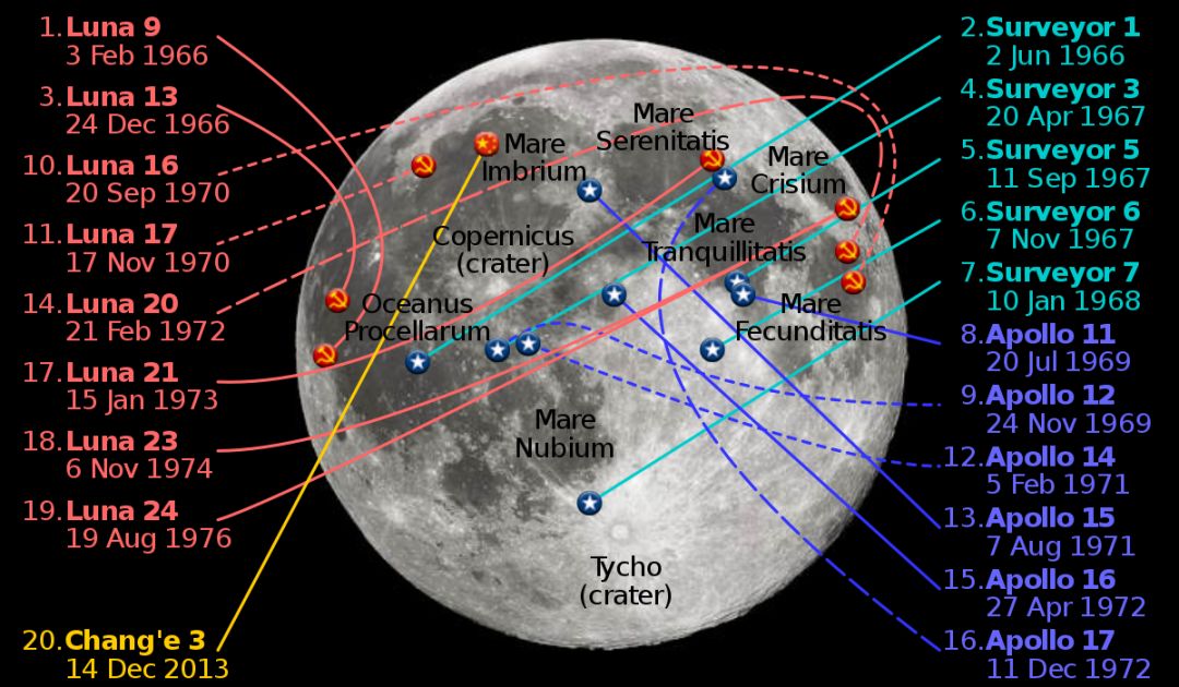 到中国嫦娥三号时,人类已经在月球正面有过20个着陆器,然而背面为0(图源:Wikipedia)