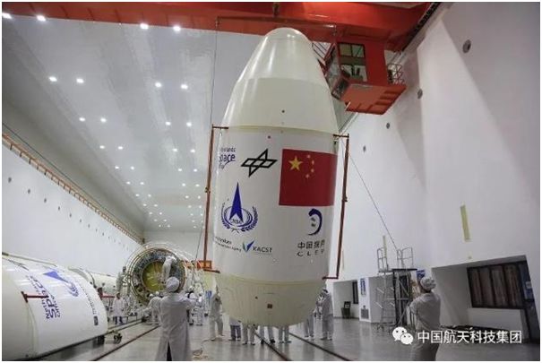 嫦娥四号任务的火箭整流罩上有众多国际机构,可以看出这是个高度国际化的任务(图源:中国航天科技集团)