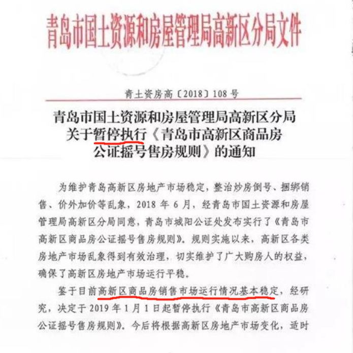 1月3日,山东青岛高新区房管局发文,暂停执行摇号政策,这是2019年全国第一松绑,这是国内首个公开取消摇号购房的城市。