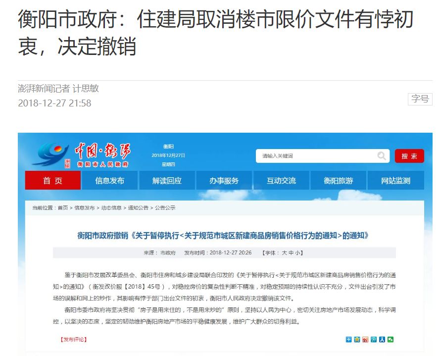 一周过去,12月27日,湖南衡阳公开取消限价,准备于1月1日正式实施。然而,仅仅过了一天,当地就迅速撤回这一文件。