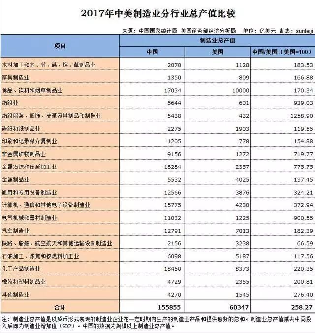 根据国家统计局和美国商务部数据,2017年,中国制造业产值为155855亿美元,而同期美国仅有60347亿美元。