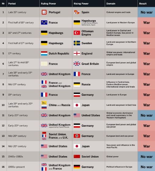 在西方500年的历史里,共产生过16个帝国霸权的更迭事件,其中有12组霸权更迭都不可避免的走向了战争!