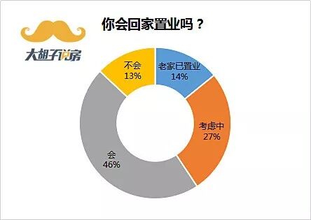 其中有回家置业打算的占比46.33%,已在老家置业的占比14.12%,二者合计达60.45%。另有26.59%的人群正在考虑中。