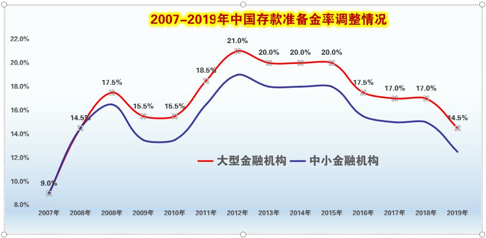 2018年,由于受美国减税、加息等政策影响,再加上贸易战,中国经济形势变差,市场上大量缺钱,尤其是到年底的时候,需要大量的资金周转,这一年整个市场上非常的缺钱,所以在2018年我们下调了3次,在2019年刚开始,我们就大幅度下调了准备金率。