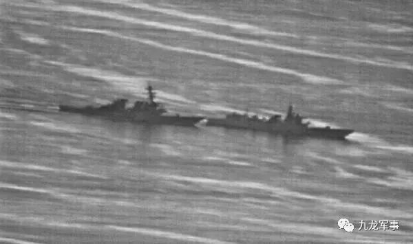 美国海军“迪凯特”号驱逐舰(左),中国海军“兰州”号驱逐舰(右)从美舰侧面高速切入其前方。