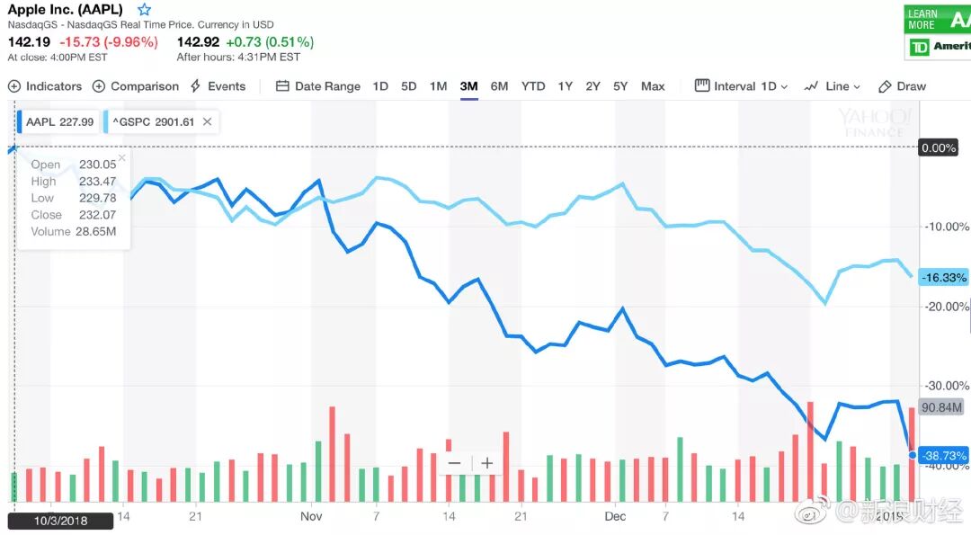 苹果公司,那是世界第一科技公司,市值曾达到万亿美元,全球市值第一。为什么突然暴跌了?根据媒体披露的消息,最直接的表面原因是,苹果手机2018年销售情况不达预期,新年伊始库克在致投资人的信中调低了第一财季(2018年 Q4)的业绩预期,营收预期从890亿美元至930亿美元,下调至840亿美元;毛利率从38%至38.5%,下调至38%左右。