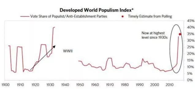 第三就是战争。全球著名对冲基金桥水基金的创始人瑞·达利欧称,衡量全球各地冲突的一项指标(民粹主义指数,下图)处于二战以来的最高水平。