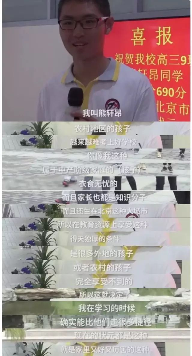 通过对教育的垄断,有钱人维持着对阶级的垄断。2017年北京高考文科状元熊轩昂说的话,将教育与阶层之间的微妙关系一语道破,这就是我们的痛点,也是这个时代的痛点!