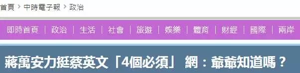 台湾《联合报》为他开脱说,蒋万安涉世未深,此次的确犯了错,但错在“不知媒体以及网民断章取义的险恶,错在未先点破蔡英文这袭‘四个必须新衣’之下,只有文青式的口号却没有具体做法的事实”。但事实上,蒋万安已经42岁了,还能说涉世未深?更何况,一个中国、九二共识这种最基本作为中国人的底线,这可以用涉世未深来开脱吗?