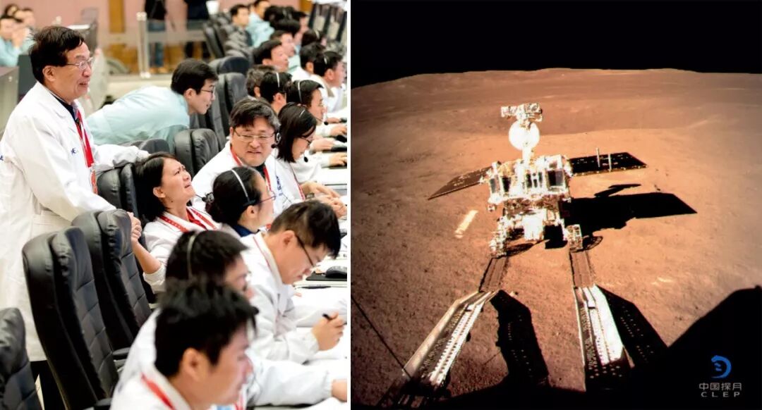 ▲ 左图:1月3日,科研人员庆祝嫦娥四号成功降落月背 金立旺摄