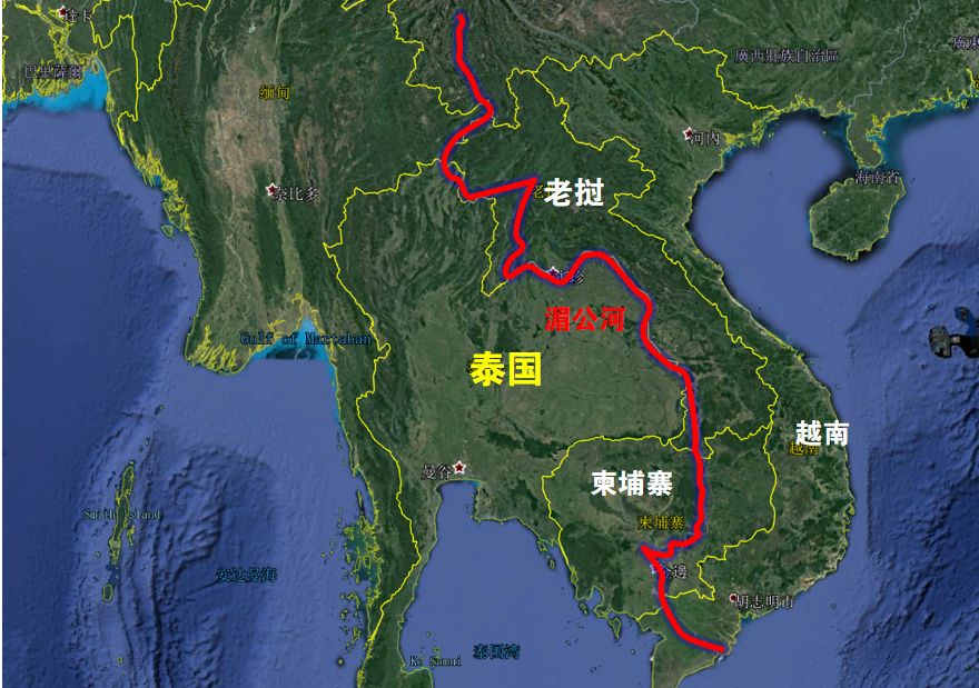 但是,我们从地形图上可以看出来:泰国和西部的缅甸是以山顶为分界线的,和南部的柬埔寨也是以上顶为分界线的,但是在东部却不是以山顶为分界线的,而是以山脚为分界线——因为在山脚下正好有一条大河——湄公河。