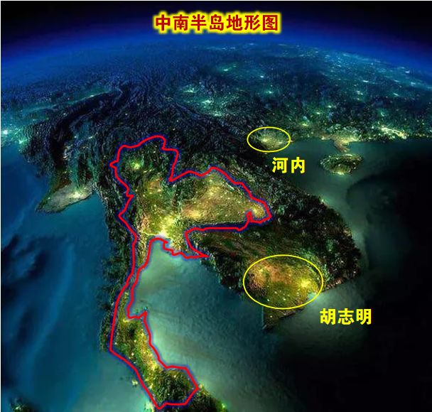 我们看看地形图:整个中南半岛,泰国的地理条件是最好的,拥有广阔的平原——中南半岛只有三处比较大的平原,而泰国是面积是最大——越南的河内和胡志明市是中南半岛少有的平原地区,但是它们的面积比泰国平原要小的多。