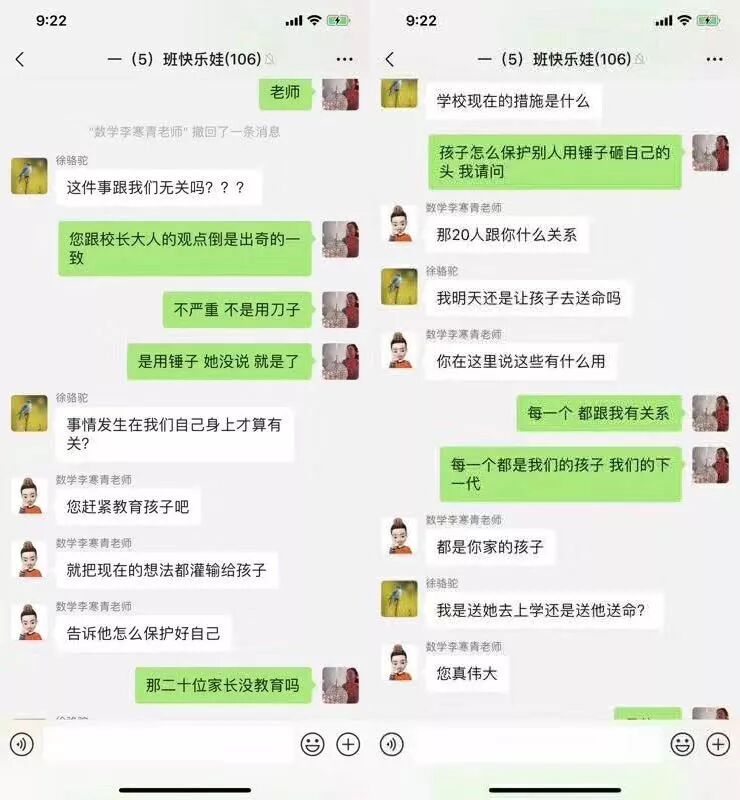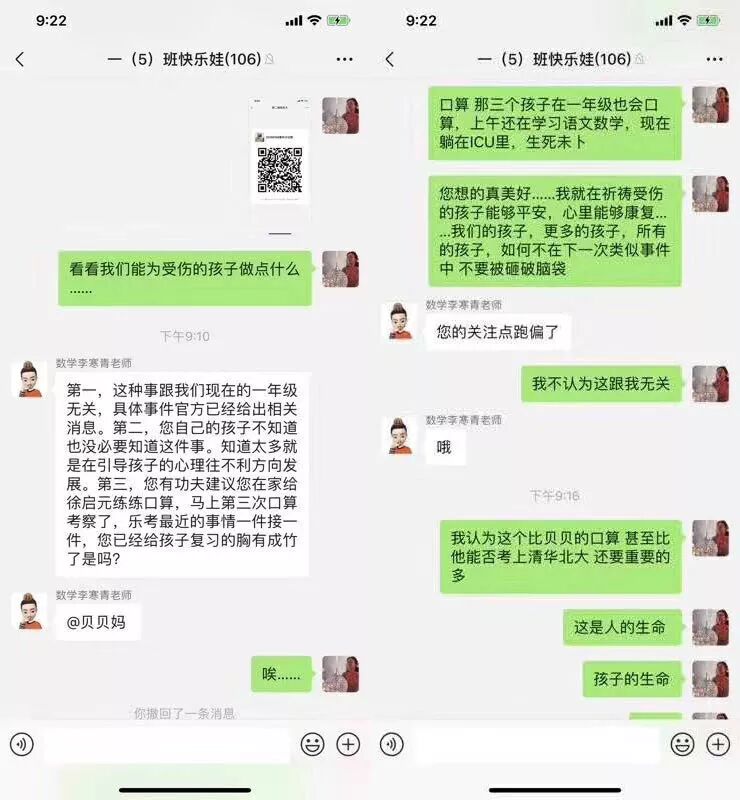 也正是因为人们的心态发生了变化,所以当宣一附小的一位数学老师在事后要求家长督促孩子练习口算,而不是关注受伤的孩子时,就无可争议地被自己推上了舆论炮轰的靶心。