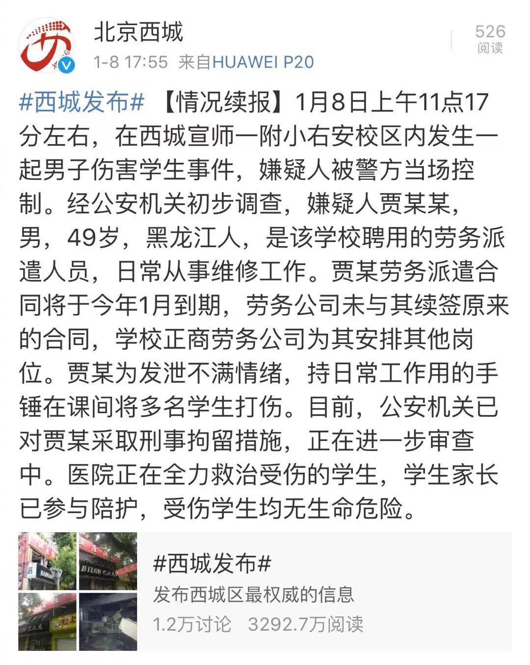 1月8日11点17分左右,北京市西城区宣师附一小发生了一起学校杂工伤害孩子的恶性事件。据悉,这名49岁的贾姓工人,因为未能与劳务派遣公司续约,便用日常工作用的手锤将多名学生打伤,以此来发泄不满。