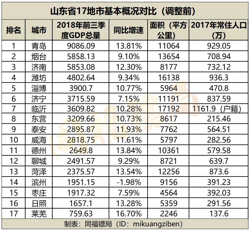 调整之前,山东共有17个地级市,济南是省会,面积8000平方公里,人口723万(2017年),经济位于青岛和烟台之后,是全省老三。而莱芜市是其中面积最小、人口最少、经济总量最低的地市。
