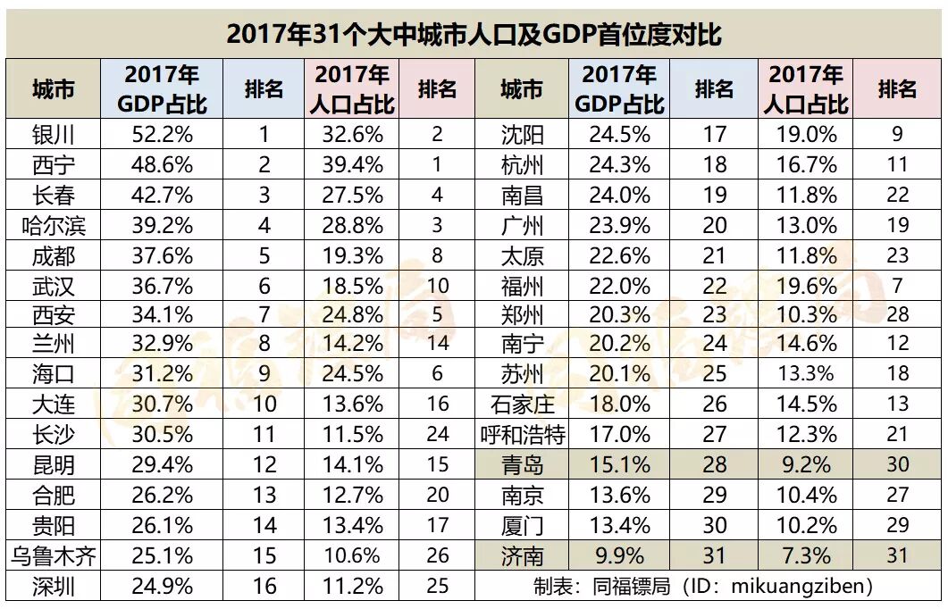 比如在人口首位度对比中,青岛排在28位,济南垫底;在经济占全省比重对比中,青岛和济南都垫了底。
