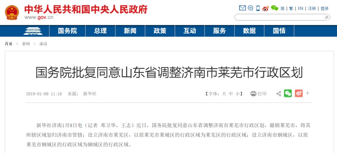 1月9日消息,国务院批复同意撤销山东省莱芜市,将其所辖区域划归济南市管辖,济南新设立莱芜区、钢城区。
