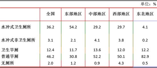 但卫生厕所还包含卫生旱厕,由于没有找到城镇居民使用冲水式卫生厕所的官方数据,但根据中金公司最近一份报告测算(《中国住房空置率很高吗?》),“城镇存量房中26%的住房无独立抽水/冲水卫生间设施”,假设城镇按20%的较高空置率计算,则城镇没有用上冲水式卫生厕所的人口为1.7亿(13.9亿*59%的城镇化率*26%*80%)。