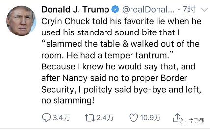 竟然说特朗普拍桌子了,特朗普很生气,他最受不了的就是对他诽谤,于是,他立刻又发了一条推特: