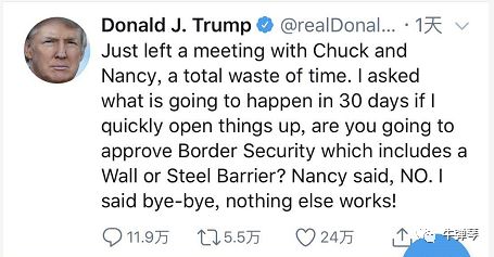 刚刚离开了与舒默和佩洛西的会议,完全在浪费时间。我问,如果我很快让一切运转起来,30天后会怎样?你们会批准包含筑墙或者钢铁屏障的边境安全法案吗?佩洛西说NO。那我说byebye吧,说啥别的都没用!