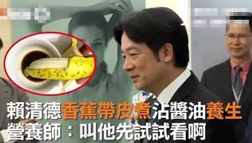 去年6月,台湾香蕉、凤梨等水果价格崩溃,农民四处哭诉,为了给香蕉找销路,赖清德跑到社交网站上发帖子,说“生香蕉可带皮水煮,并可搭配酱油、大蒜,养生又美味”。