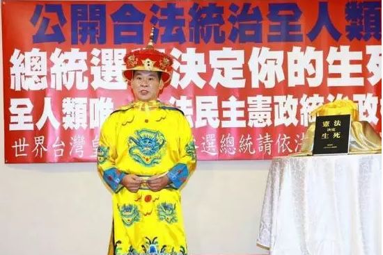最奇葩的还是蓝信祺,参加台湾大选时自称世界台湾皇帝,口号就是“不支持他全家死绝”……
