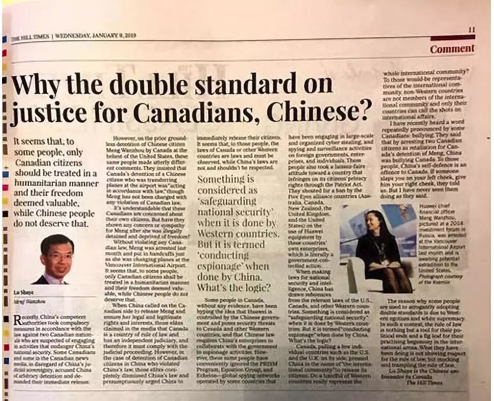 1月9日,卢大使在加《国会山时报》发表题为《不要让傲慢与偏见蒙蔽了双眼和灵魂》的署名文章,指出加拿大等西方某些势力一贯对华采取双重标准,法治只是他们实现政治目的的工具,他们的所做所为是对法治的嘲弄和践踏。