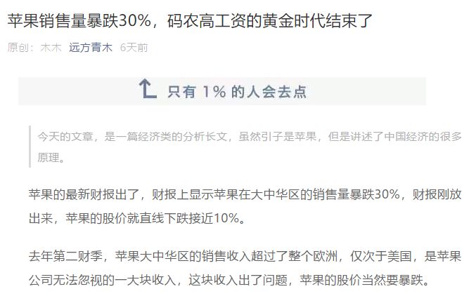 苹果本次的降价事出有因,就在6天前,我就发了一篇文章,告知了大家苹果销量大跌30%导致股价暴跌的消息。大中华区的销量等同于整个欧洲,苹果公司为了挽回断崖式下跌的销量,自然要大幅降价,否则难以为继。