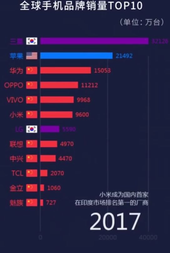 这个视频截止于2017年的数据,在这一年,我们看到排行榜上出现了一片红色,全面对三星和苹果发动了围剿。