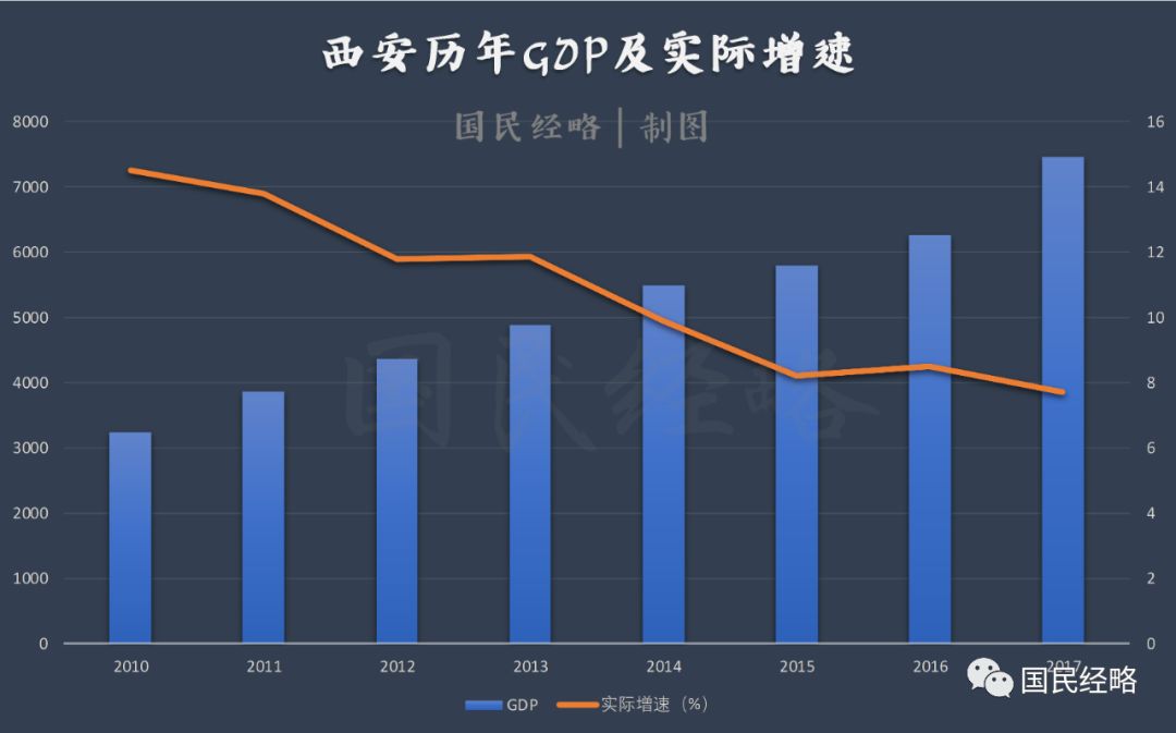 在经济方面,2017西安GDP总量为7469亿元,2018年将突破8000亿元,有望进入全国前20强,而要在2020迈上万亿台阶,西安仍要保持如今的高增长态势。