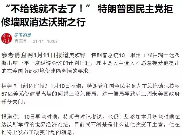 当然,虽然对特朗普来说达沃斯论坛没什么意思,但如果民主党以同意边境墙换取他参加论坛负起大国责任,想必这位老先生一定甘之如饴——既能建边境墙,又能一怼全球的左派卫道,绝对是一件快事。