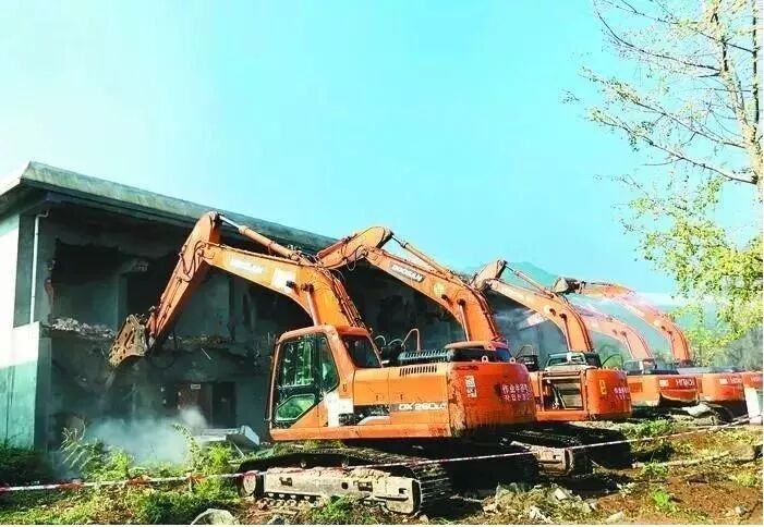 往事越千年,现代科技的高度发展,拆房子不用放火了,有挖掘机、破壁机。远远望去,排成一列的机械车张牙舞爪的进攻一大片别墅群。破壁机先上,捅破别墅的主体框架;挖掘机跟进,哗啦啦把别墅铲成垃圾。