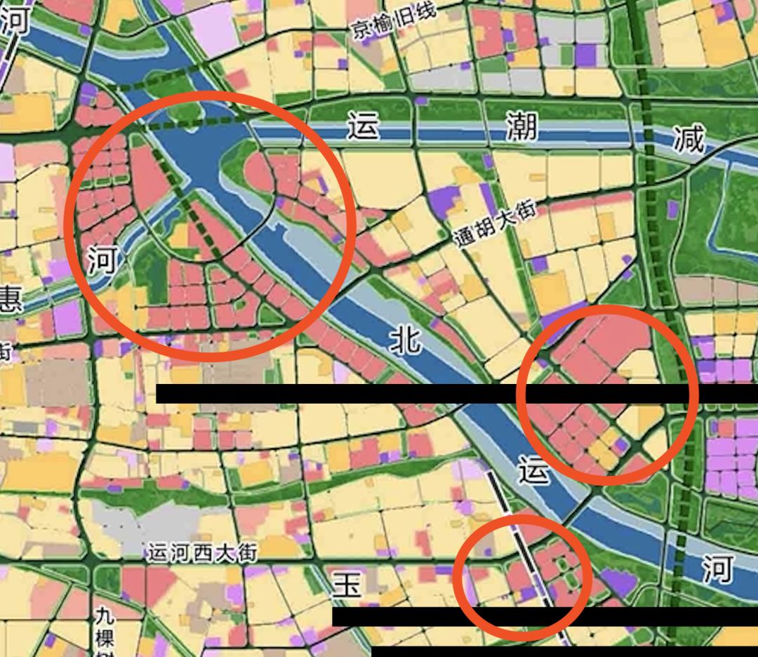 在这里面,我们还要注意一个颜色——粉色,它的意义是居住产业混合用地,俗称商住公寓楼。这种颜色多的地段反而会抑制周边纯住宅房价的升值空间,因为公寓会分流走一部分居住需求,所以尽量避开。