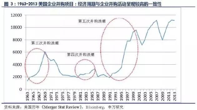 尤其明显的是第三、四、五次美国并购浪潮分别处于:战后美国经济的“黄金时代”、80 年代由大规模结构调整推动的经济增长,90 年代新经济推动的经济强劲增长阶段。
