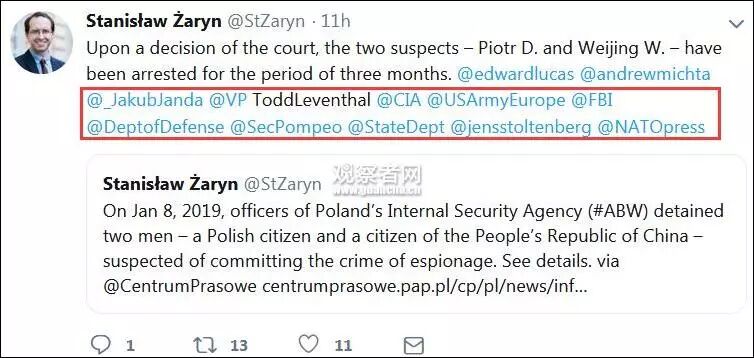 随后,波兰国家情报机关发言人扎瑞在推特上宣布被捕人员身份时,将美国CIA、FBI、国务院等在内的6个部门全部@了一遍。