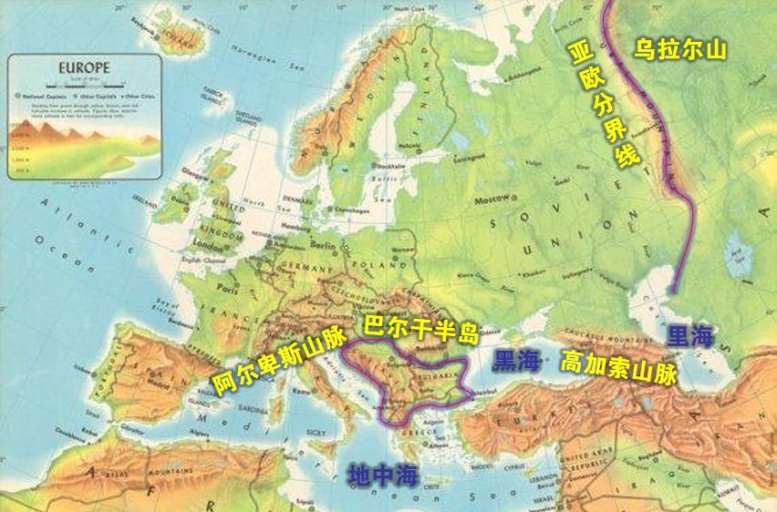 下面我们来看看欧洲的地形图:欧洲和北亚以乌拉尔山为分界线,乌拉尔山以东属于亚洲的北亚,也就是西伯利亚极寒之地,由于西伯利亚地区不适合人类大规模的生存,所以俄罗斯的主要人口都分布在气候相对温暖的东欧平原,这就是更多的俄罗斯人认为自己属于欧洲的主要原因;欧洲的南部分别由里海→高加索山脉→黑海→巴尔干半岛→阿尔卑斯山脉等组成的一个封闭地理空间。