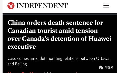 比如英国《独立报》,标题就是:中国命令判决加拿大游客死刑,正值双方因加拿大逮捕华为高管紧张之际。