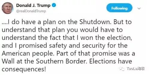 “确实是有结束政府关门状态的计划。但要理解这个计划,必须理解这个事实,是我赢得大选,我还曾承诺保卫美国人民安全。承诺的一部分,就是建立边境墙。选举是有后果的!”
