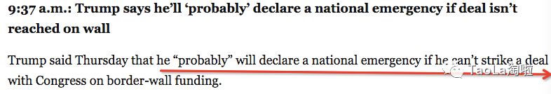 最近一次和民主党领袖会谈中再次谈崩,没见松口。如果松口,更是违背了他大选时候的承诺,实在不像他川普的作风。所以他甚至提出,不排除通过进入国家紧急状态的方法,来绕过国会的限制。