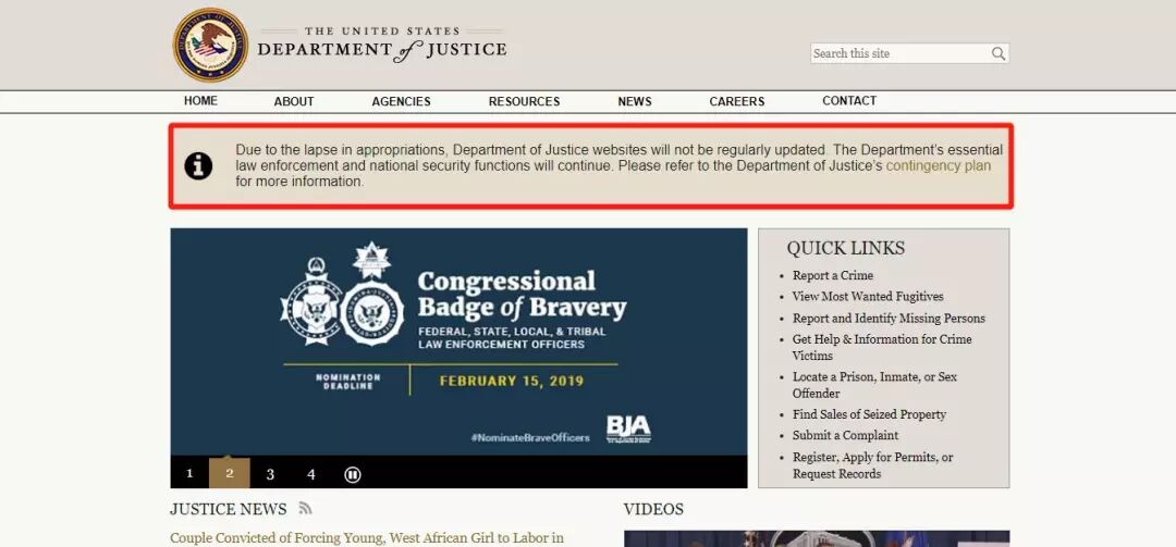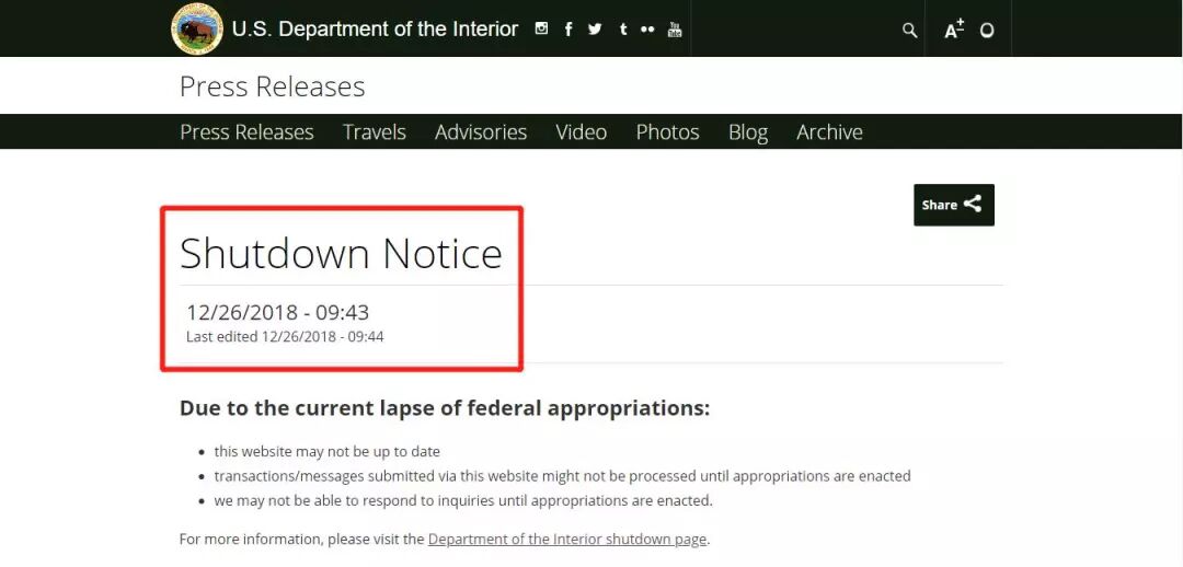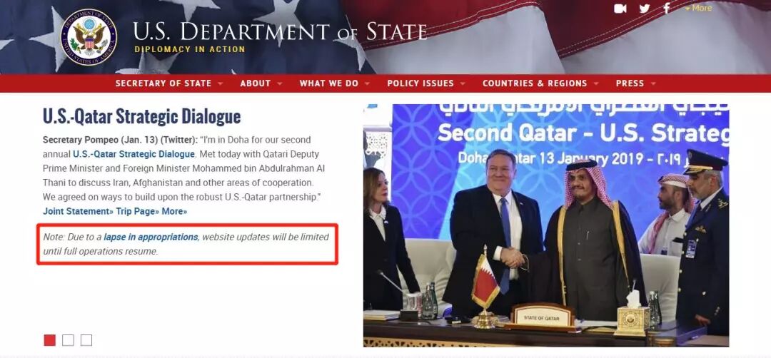 美国联邦政府15个部门中,国务院、国土安全部、司法部、内政部、农业部、住房与城市发展部、商务部、财政部和运输部共9个部门已经停止非必要工作,在各自的官网上挂出停止更新的通知,财政部和运输部还贴心地挂出了《休假员工指南》,解答各种疑问。