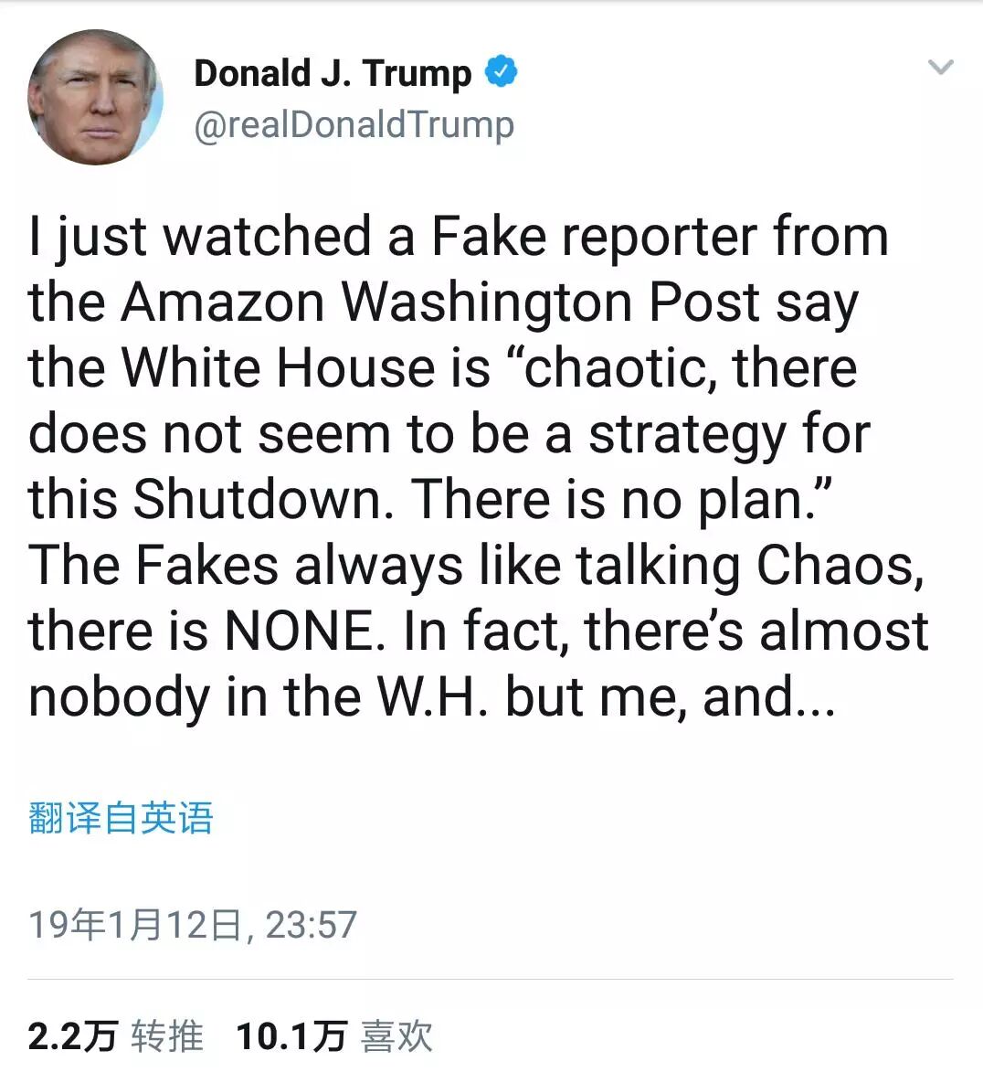 特朗普又上头条了,跟创下历史关门时间最长的联邦政府一起。