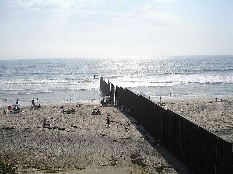 (2006年10月,美墨边境最西端的太平洋。围栏一直延伸到海里。左为墨西哥蒂华纳,右为美国加利福尼亚州圣地亚哥。)