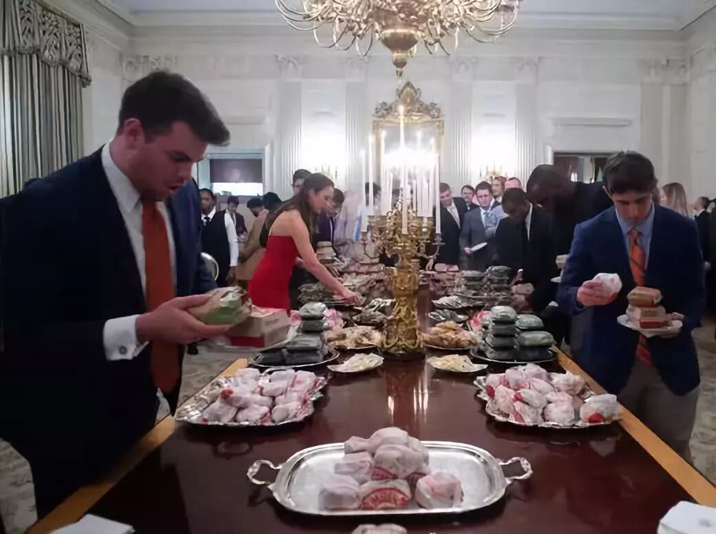 当地时间1月14日,美国联邦政府关门进入第24天。特朗普在白宫招待今年美国大学生橄榄球总冠军,克莱姆森大学老虎队。特朗普自豪地表示,由于美国政府关门,白宫厨师停薪休假,自己掏钱,买了自己最爱的麦当劳来招待客人。“这里有300多个汉堡,绝对够吃!“