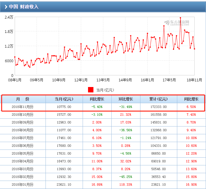 为了支撑我的这个观点,我去查了一下我国的财政收入数据,发现2018年11月的时候,中国的财政收入迎来了这一年的首次同比和环比双双下跌,这说明我的观点是正确的。