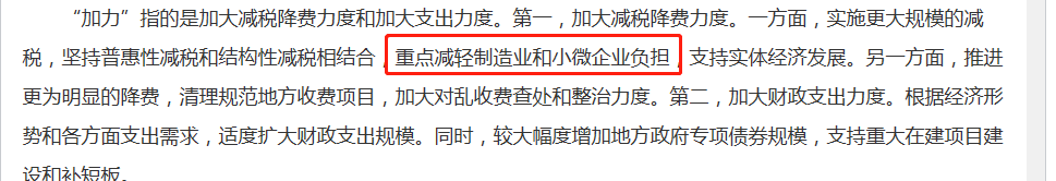 另外说一下小微企业,在会议当中其实也说了,在减税上是惠普性减税和结构性减税,重点减轻制造业也小微企业负担。