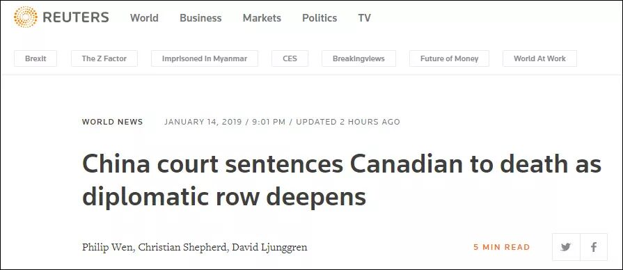 路透社标题:中加紧张态势上升之时,加拿大人在中国被判处死刑”