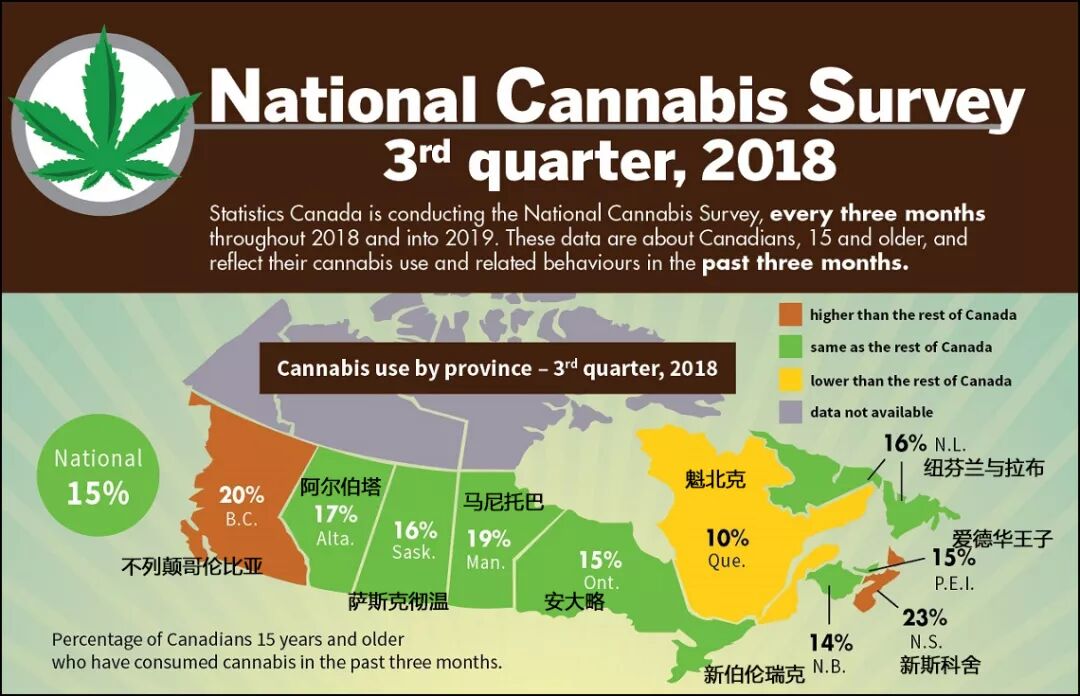 加拿大统计局2018年第3季度,15岁以上、过去3月里吸食过大麻的人数,绿色为全国平均值