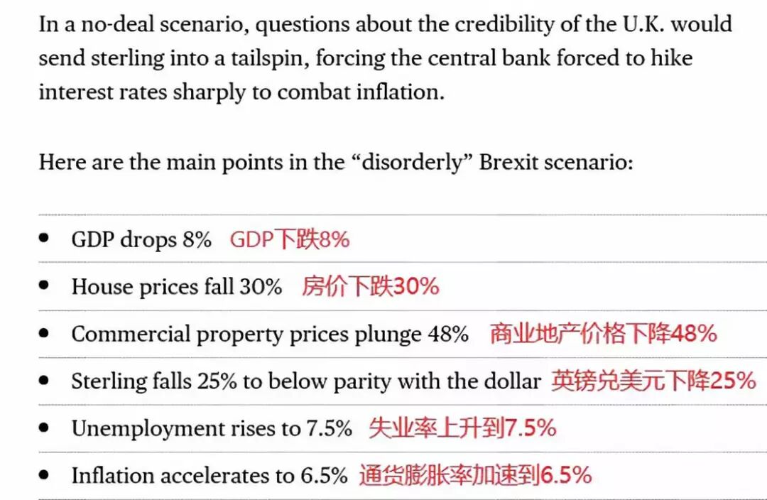 英格兰银行发布的《金融稳定报告》中指出,如果英国选择硬脱欧,英国也许将面临比金融危机更严重的衰退,脱欧后GDP将下降8%,房价下跌30%,通胀上升至6.5%,英镑贬值25%等等。
