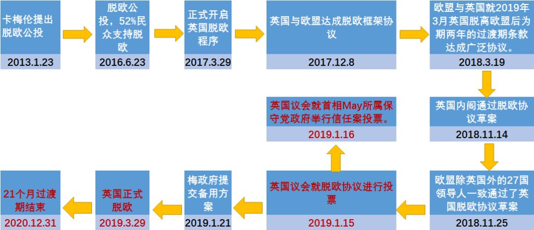 2013年1月23日,英国前首相卡梅伦为稳定政局正式提出脱欧公投,2016年6月23日发起脱欧公投,民众投票以52%-48%支持英国脱欧,卡梅伦辞职。这是英国脱欧的开始。